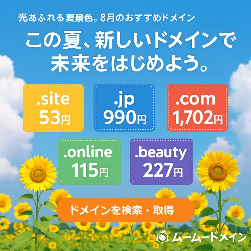 ムームードメインが2025年8月のおすすめドメインを特別価格でご紹介。.siteや.jp、.comなど人気ドメインをお得に取得できるこの夏、あなたのウェブプロジェクトを始めるチャンスです!
